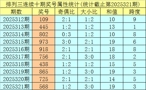 上期追思:枚举三第2025321期奖号:568。类型:组六,奇偶模式:奇偶偶,大小模式:大大大,和值:19,跨度:3。