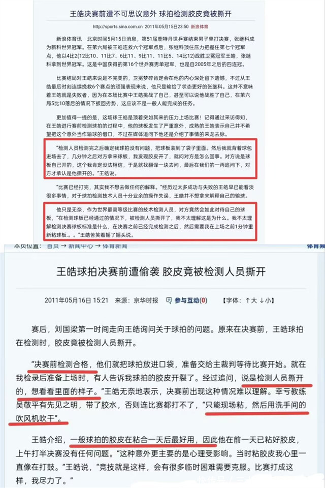 值得一提的是,国乒球员赛前拍子出现问题依然不是第一次了。2011年鹿特丹世乒赛男单决赛前,王皓的拍子胶皮就出现侵犯题,其后在磋议后才知谈是检测东谈主员撕开的,对方给出的原理思望望内部的格式,原理谬妄但亦然无疾而终,最终效果群众皆知谈,那场比赛王皓输给了张继科!